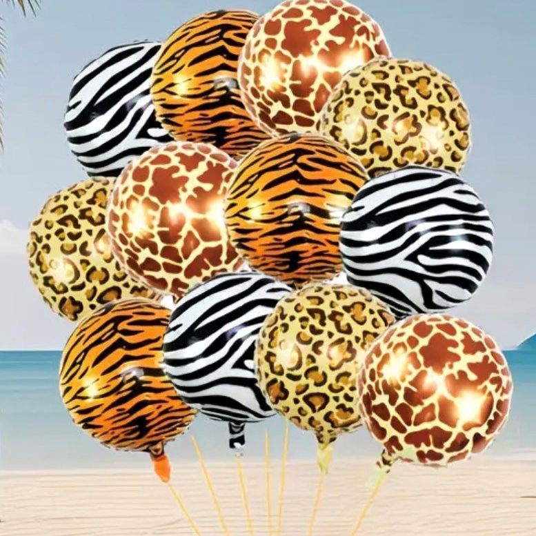 Foil animal print balloons paired with a Simba sticker—party-ready combo.